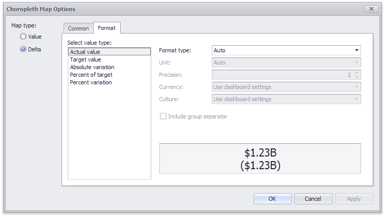 You can specify which values to display within map tooltips. Use the Value type combo box to select the value that will be displayed as the delta value.