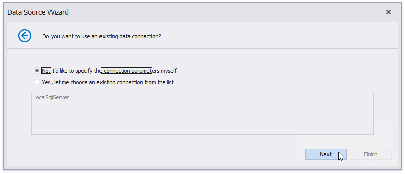 The next page allows you to specify whether you want to use an existing data connection or create a new data connection from scratch. Select the first option to create a new connection and click Next.