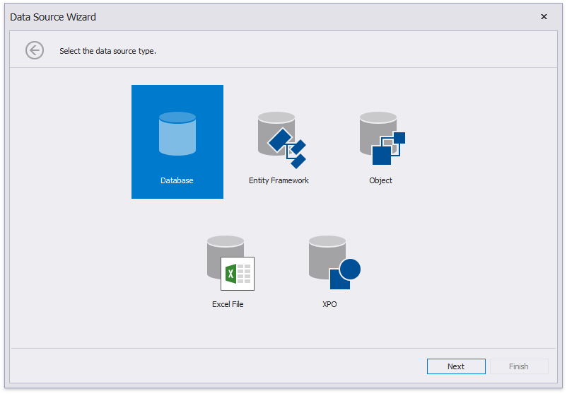 On the first page of the invoked Data Source Wizard, select Database and click Next to proceed.