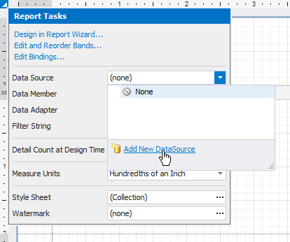 Click the report's smart tag. In the invoked actions list, expand the drop-down menu for the Data Source property and click Add New DataSource.
