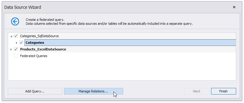 On the next page, enable check boxes for the SQL data source's table and the Excel data source. The selected items are included in data federation as separate queries.