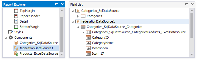 The Data Source Wizard creates a new FederationDataSource that includes two queries with a master-detail relationship. This data source becomes available in the Report Explorer's Components node. The Field List reflects the data source's structure.
