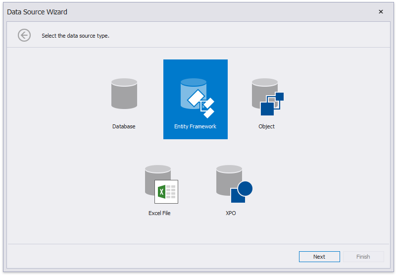 On the first page of the invoked Data Source Wizard, select the Entity Framework and click Next.