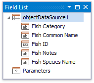 The newly created data source will be displayed in the Components node of the Report Explorer. Additionally, the hierarchy of the data source will be reflected by the Field List.