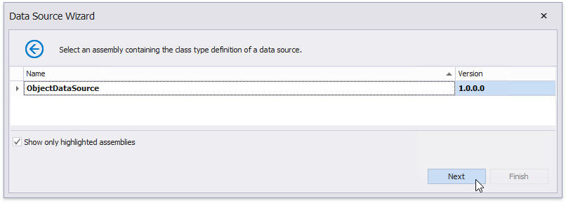The following wizard page allows you to select an assembly that contains the data source's class type definition. Use the Show only highlighted assemblies checkbox to exclude irrelevant assemblies from this list.