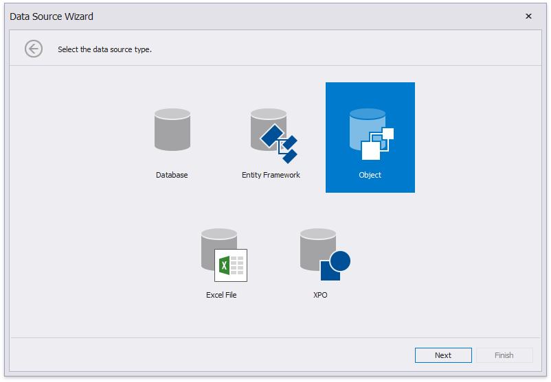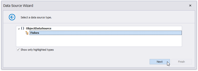 On the next wizard page, select a data source type. Enable the Show only highlighted types checkbox to hide irrelevant classes from this list.