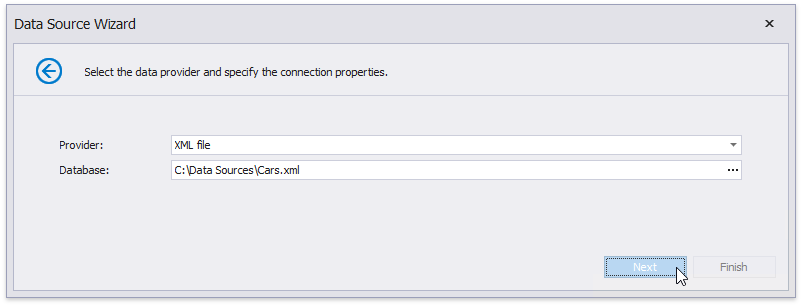 On the next page, specify the data provider (XML file) and the path to the database file.