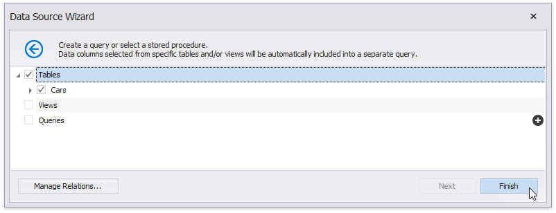 On the next page, you can choose which tables, views and/or stored procedures to add to the report. You can also construct custom queries using the Query Builder. Click Finish to exit the wizard.