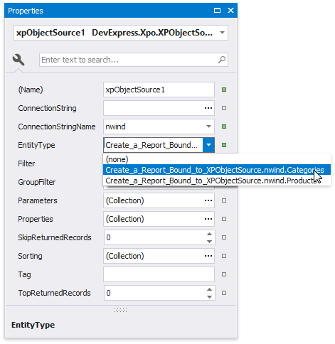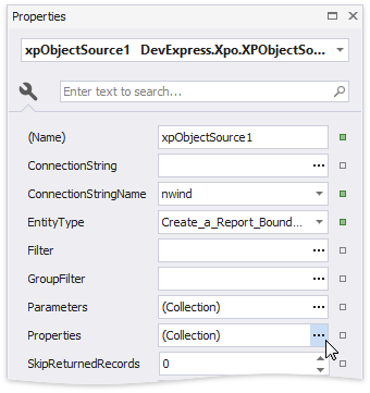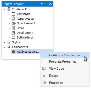 You can customize the created XPObjectSource component's settings. To do this, select this component in the Report Explorer and switch to the Property grid.