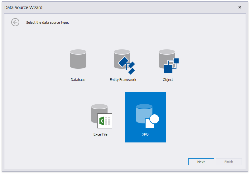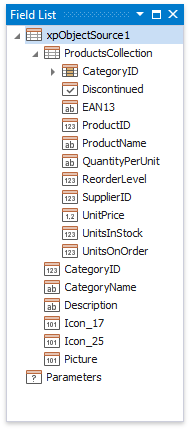 Finish the wizard. At this step, the wizard creates an XPObjectSource component. This component retrieves all the properties the chosen entity type includes. The Field List reflects the data source structure.
