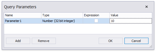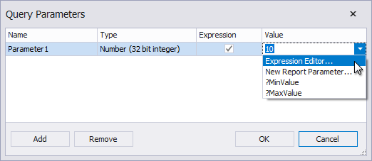 Specifies the query parameter's actual value (a static or dynamically calculated). If the Expression option is enabled, you can assign a report parameter or an expression that can also include a report parameter.