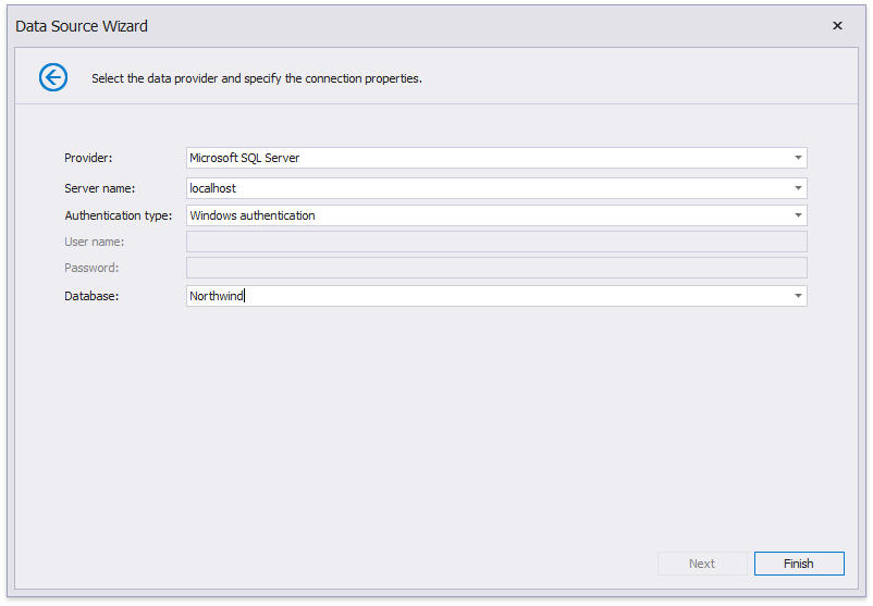 To create a new data connection, select a data provider or define a custom connection string.