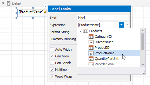 After you bind your report to data, the Field List panel displays the data source's hierarchy and provides access to the available data fields.