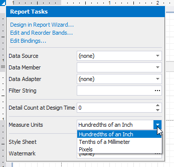 To assign a system of measurements to a report, use its Measure Units property. You can specify this property either in the report's smart tag...