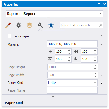 For the orientation and paper size, you can specify a requirement that applies the corresponding printer settings instead of the report's. In this instance, the page properties in the Property Grid are disabled and displayed as grayed out. This may be useful when the report is printed in several places with different printers and printer settings.