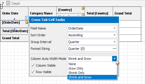 Use a cell's Column Auto Width Mode property to specify a cell width calculation method. The Report Wizard sets this property to Shrink And Grow for row headers and to None for other cells.