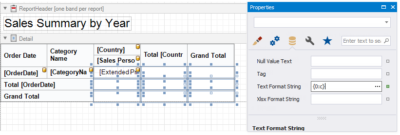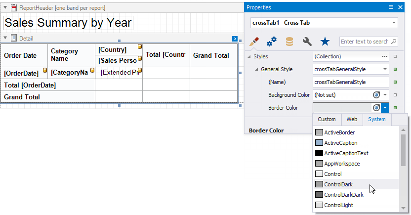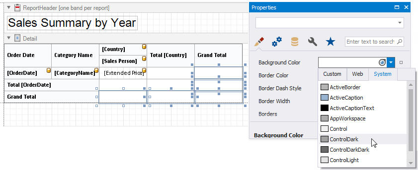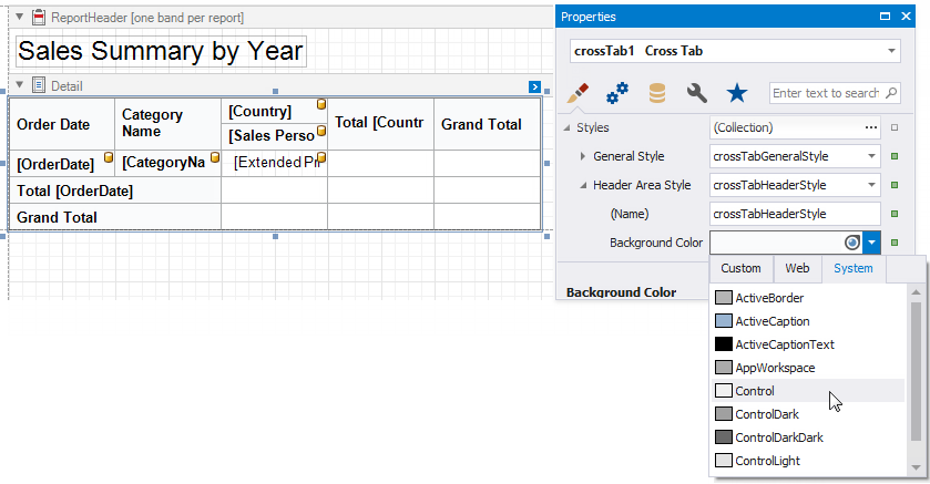 Hold down SHIFT or CTRL, and select the cells that display the grand total values. Go to the Properties window and set Background Color to ControlDark. This value applies to the selected cells only and overrides the value specified at the area level.