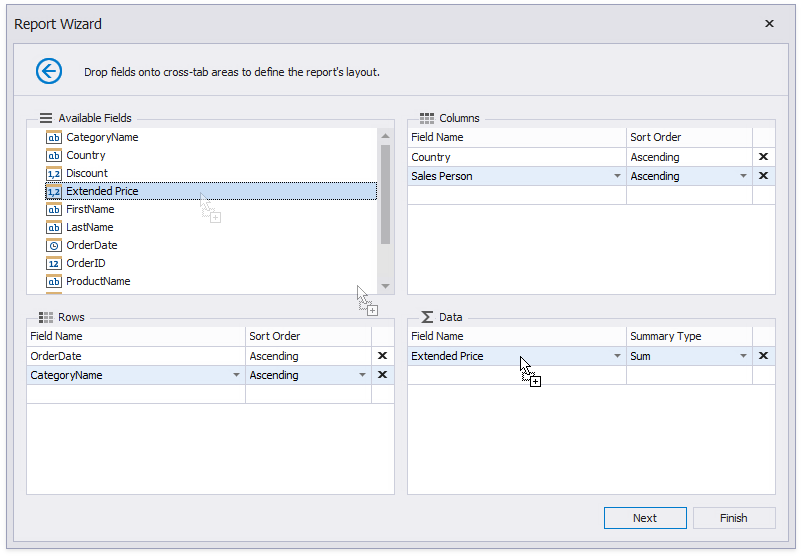 Drop data fields onto cross-tab areas to define row/column headers and data.