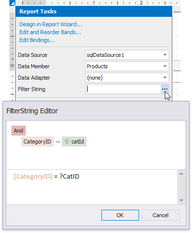 Click the report's smart tag, and in its actions list, click the Filter String property's ellipsis button.