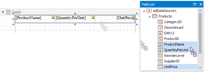 Switch to the Field List, select the data fields while holding down CTRL or SHIFT and drag-and-drop them onto the Detail band.