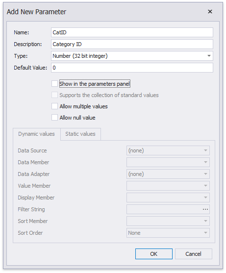 In the invoked Add New Parameter dialog, specify the parameter's Name and Type as well as disable the Show in the parameters panel option.