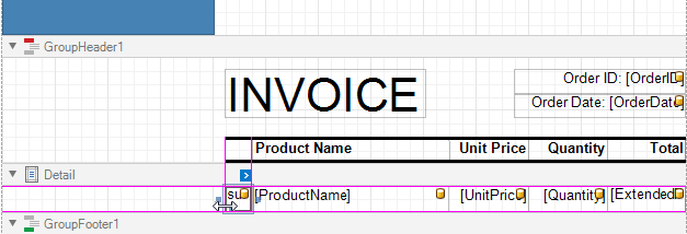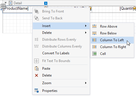 Right-click the first cell in the Detail band's table and select Insert / Column to Left from the context menu.