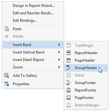 Right-click the design surface. Select Insert Band / GroupHeader from the context menu.