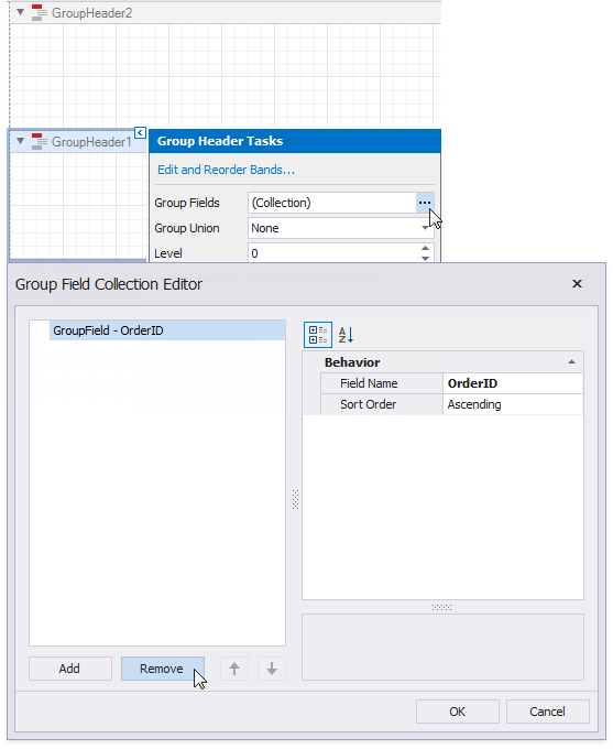 Click GroupHeader1's smart tag, click the Group Fields property's ellipsis button and remove the group field from the invoked Group Field Collection Editor.