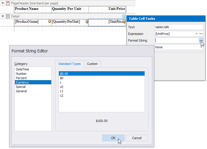Define a currency format for the UnitPrice cell. Click the cell's smart tag, and then, click the Format String property's ellipsis button. Select the appropriate format in the invoked Format String Editor editor and click OK.