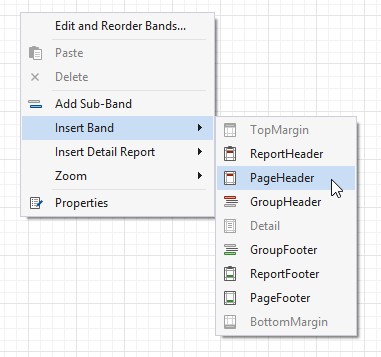 Add the Page Header band to the report to print the column headers at the top of every document page. To do this, right-click the report's surface, and select Insert Band | PageHeader in the context menu.