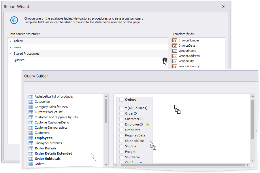 You can combine several different tables' or views' data fields by creating a custom query. Click the Queries category's plus button, and in the invoked Query Builder, join data tables and views based on key columns.