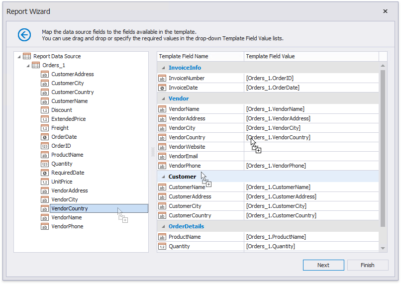 Drag and drop the required data field form the tree on the left-hand side onto the corresponding template field's column.