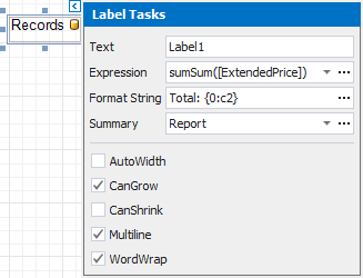 Back in the Label Tasks window, use the Format String property to format the summary's value (for instance, set it to Total: {0:c2}).