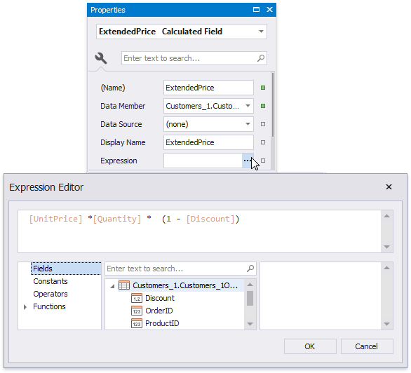 Select the created calculated field, and in the Property Grid, change its name to ExtendedPrice. Click the Expression property's ellipsis button, and in the invoked Expression Editor, construct the expression based on the UnitPrice, Quantity and Discount fields.