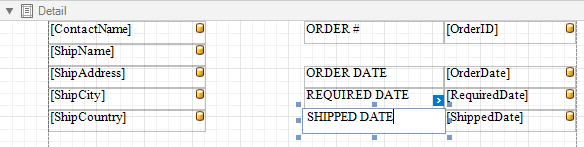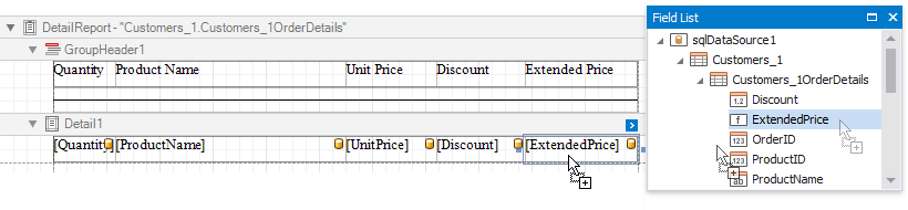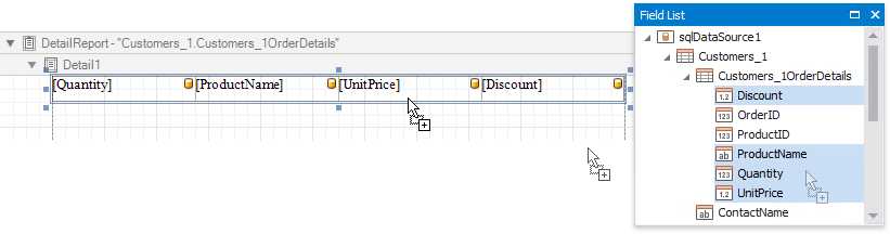 Add dynamic content to the detail report. Go to the Field List, select the data fields while holding down CTRL or SHIFT and drag-and-drop them onto the Detail band. This automatically creates a Table control with table cells bound to the corresponding fields.