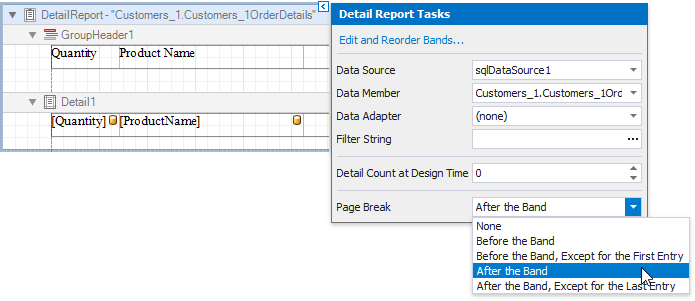 Click the Detail Report band's smart tag, and in the invoked actions list, set the band's Page Break property to After the Band to print each order on a separate page.