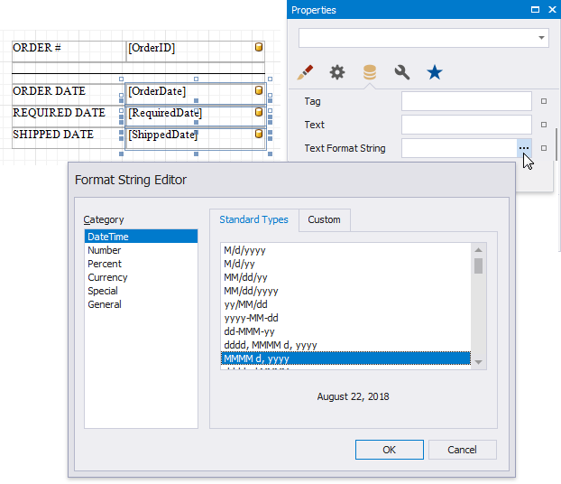 Click the Text Format String property's ellipsis button, and in the invoked Format String Editor, select a date format as in the Format Data section above.