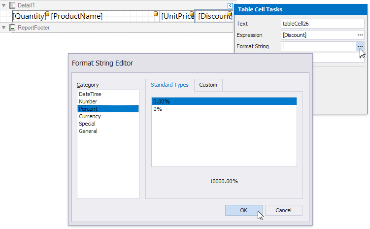 Select the table cell bound to the Discount data field in the detail report's Detail band and click its smart tag. Click the Format String property's ellipsis button, and in the invoked Format String Editor, apply the Percent format. In this case, field values are multiplied by 100 and displayed with a percent symbol.