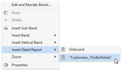 Create a Detail Report Band by right-clicking the report's surface. In the invoked context menu, select Insert Detail Report, and then, select the master-detail relationship's name.