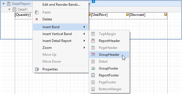 Add the Group Header band to the detail report to display captions for table columns. Right-click the detail report, and in the context menu, select Insert Band | GroupHeader.