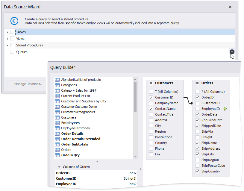 Obtain data from two different tables to display information about customers and orders at the same hierarchical level in the report. Click the plus button for the Queries category to create a custom query. In the invoked Query Builder, add the required data tables to a query and join them based on a key column.