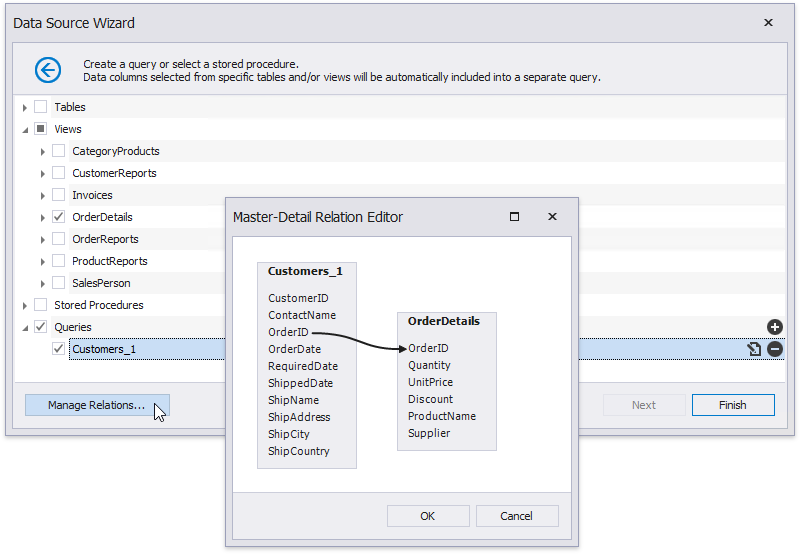 On the same wizard page, select the data view providing order details for listing products included in each order in the invoice. Click the Manage Relations button to specify a master-detail relationship between the queries. In the invoked dialog, connect the required key columns using drag-and-drop.