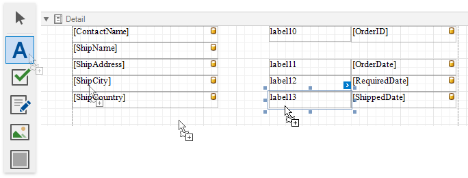 Drop Label controls from the Toolbox onto the band to display static captions for specific data fields.