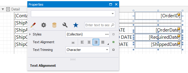 Change specific controls' (bound to date fields, price fields, etc.) text alignment using the Text Alignment property.