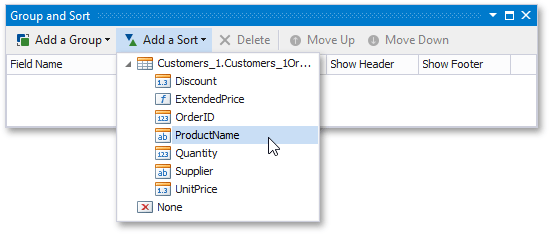 Select the Detail band in the detail report and switch to the Group and Sort Panel. Click Add a Sort, and in the invoked drop-down window, select the required data field.