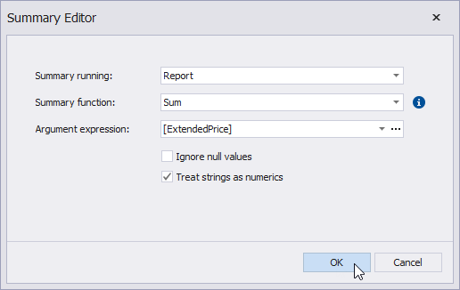 - Set the Summary running property to the Report value to calculate the summary for the entire detail report.