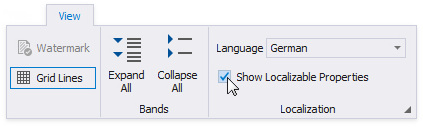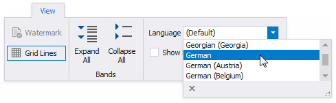 In the Report Designer Toolbar, switch to the View tab and select the language in the drop-down list in the Localization group.