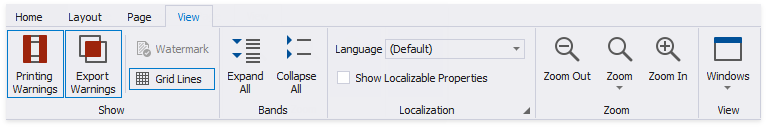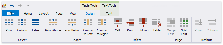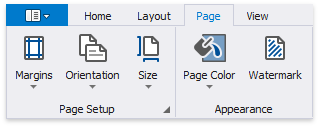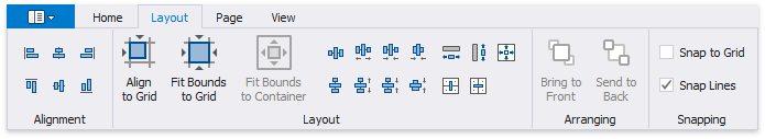 The Report Designer Toolbar includes the Home, Layout, Page, and View tabs for general commands as well as contextual tabs for commands relating to the selected report controls.