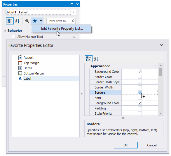 Click the Edit Favorite Property List context menu item to set up the favorite properties. Enable check boxes for the controls' properties in the invoked Favorite Properties Editor to include these properties into the favorite list.