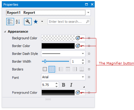 The Property Grid allows you to access and customize report/report element settings.